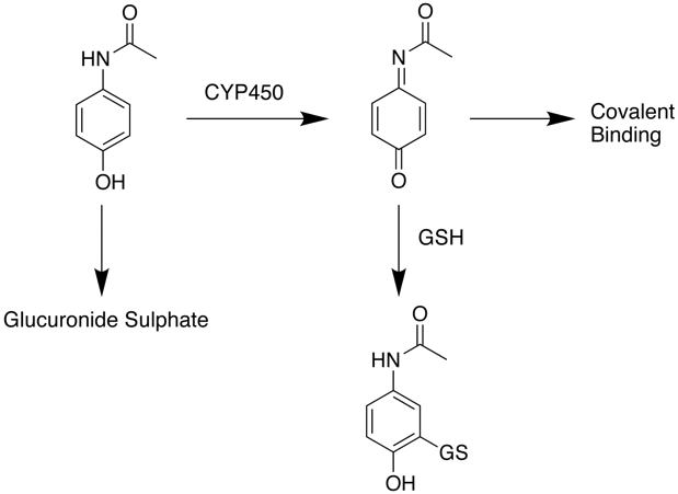 Whilst toxicity in many organ types have been observed the majority of ADR involve the liver. Over 600 drugs have been associated with hepatotoxicity, ranging from mild, asymptomatic changes in serum transaminases, which occur at a relatively high frequency with a number of drugs, to complete hepatic failure requiring liver transplant. The major role of the liver is the removal of xenobiotics and it perhaps not surprising that the high concentrations of drugs found in the liver also result in high concentrations of potentially reactive metabolites. In some cases the normal route for clearance may be quite benign but at high drug concentrations an alternative toxic route may be involved. In the case of acetaminophen (paracetamol) at therapeutic doses the main route for clearance is glucuronylation and sulphation followed by renal clearance. A minor amount the parent compound is oxidised to N-acetyl-p-benzoquinoneimine and mopped up by glutathione (GSH). After overdose however this pathway is saturated and the reactive N-acetyl-p-benzoquinoneimine covalently reacts with liver proteins.